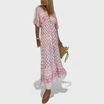 Šaty Mabel jsou ideální volbou pro ženy, které milují bohémský styl a pohodlí. Jsou vyrobeny z lehkého a splývavého materiálu s nádherným potiskem, který se skvěle hodí na letní dny. Volný střih s výstřihem do V a nastavitelným vázáním v pase vytváří lichotivou siluetu, zatímco pohodlí a elegance zůstávají na prvním místě.